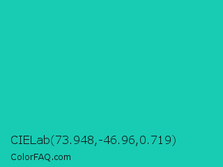 CIELab 73.948,-46.96,0.719 Color is a normal cyan color and the nearest color is Java #1fc2c2. Hex code #17ccb3 and RGB value is rgb(23,204,179). In RGB color space, this color is composed of 9% red, 80% green, 70% blue, In CMYK color space, this color is composed of 89% cyan, 0% magenta, 12% yellow , 20% black , In HSL color space, this color has a hue angle of 172° , 80% saturation and 45% lightness.