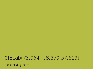 CIELab 73.964,-18.379,57.613 Color is a normal yellow color and the nearest color is Turmeric #cabb48. Hex code #b5bd45 and RGB value is rgb(181,189,69). In RGB color space, this color is composed of 71% red, 74% green, 27% blue, In CMYK color space, this color is composed of 4% cyan, 0% magenta, 63% yellow , 26% black , In HSL color space, this color has a hue angle of 64° , 48% saturation and 51% lightness.