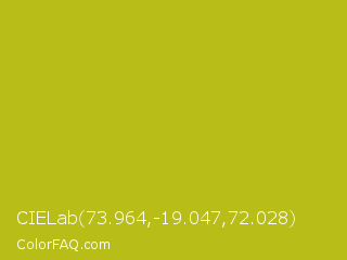 CIELab 73.964,-19.047,72.028 Color is a normal yellow color and the nearest color is Acid Green #b0bf1a. Hex code #b8bd17 and RGB value is rgb(184,189,23). In RGB color space, this color is composed of 72% red, 74% green, 9% blue, In CMYK color space, this color is composed of 3% cyan, 0% magenta, 88% yellow , 26% black , In HSL color space, this color has a hue angle of 62° , 78% saturation and 42% lightness.