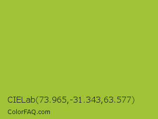 CIELab 73.965,-31.343,63.577 Color is a normal lime color and the nearest color is Android Green #a4c639. Hex code #9fc334 and RGB value is rgb(159,195,52). In RGB color space, this color is composed of 62% red, 76% green, 20% blue, In CMYK color space, this color is composed of 18% cyan, 0% magenta, 73% yellow , 24% black , In HSL color space, this color has a hue angle of 75° , 58% saturation and 48% lightness.