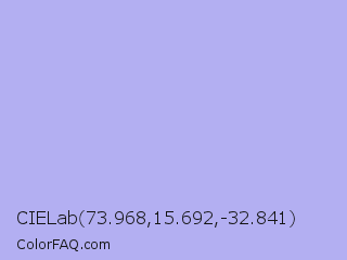 CIELab 73.968,15.692,-32.841 Color is a very light indigo color and the nearest color is Maximum Blue Purple #acace6. Hex code #b3aff2 and RGB value is rgb(179,175,242). In RGB color space, this color is composed of 70% red, 69% green, 95% blue, In CMYK color space, this color is composed of 26% cyan, 28% magenta, 0% yellow , 5% black , In HSL color space, this color has a hue angle of 244° , 72% saturation and 82% lightness.