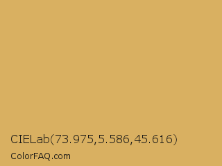 CIELab 73.975,5.586,45.616 Color is a light orange color and the nearest color is Earth Yellow #e1a95f. Hex code #d9b061 and RGB value is rgb(217,176,97). In RGB color space, this color is composed of 85% red, 69% green, 38% blue, In CMYK color space, this color is composed of 0% cyan, 19% magenta, 55% yellow , 15% black , In HSL color space, this color has a hue angle of 40° , 61% saturation and 62% lightness.