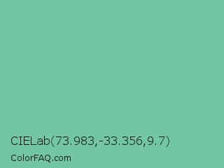 CIELab 73.983,-33.356,9.7 Color is a light green color and the nearest color is Acapulco #7cb0a1. Hex code #73c6a3 and RGB value is rgb(115,198,163). In RGB color space, this color is composed of 45% red, 78% green, 64% blue, In CMYK color space, this color is composed of 42% cyan, 0% magenta, 18% yellow , 22% black , In HSL color space, this color has a hue angle of 155° , 42% saturation and 61% lightness.