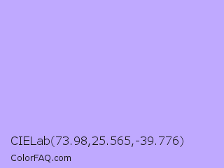 CIELab 73.98,25.565,-39.776 Color is a very light indigo color and the nearest color is Pale Violet #cc99ff. Hex code #bfa9ff and RGB value is rgb(191,169,255). In RGB color space, this color is composed of 75% red, 66% green, 100% blue, In CMYK color space, this color is composed of 25% cyan, 34% magenta, 0% yellow , 0% black , In HSL color space, this color has a hue angle of 255° , 100% saturation and 83% lightness.