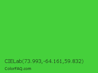CIELab 73.993,-64.161,59.832 Color is a normal green color and the nearest color is Lime Green #32cd32. Hex code #45d03b and RGB value is rgb(69,208,59). In RGB color space, this color is composed of 27% red, 82% green, 23% blue, In CMYK color space, this color is composed of 67% cyan, 0% magenta, 72% yellow , 18% black , In HSL color space, this color has a hue angle of 116° , 61% saturation and 52% lightness.