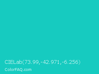 CIELab 73.99,-42.971,-6.256 Color is a normal cyan color and the nearest color is Java #1fc2c2. Hex code #16cbc0 and RGB value is rgb(22,203,192). In RGB color space, this color is composed of 9% red, 80% green, 75% blue, In CMYK color space, this color is composed of 89% cyan, 0% magenta, 5% yellow , 20% black , In HSL color space, this color has a hue angle of 176° , 80% saturation and 44% lightness.