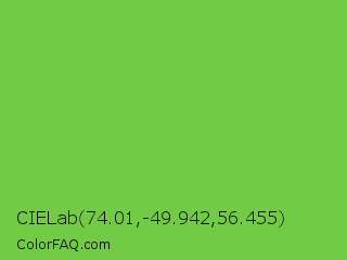 CIELab 74.01,-49.942,56.455 Color is a normal green color and the nearest color is Mantis #74c365. Hex code #72cb45 and RGB value is rgb(114,203,69). In RGB color space, this color is composed of 45% red, 80% green, 27% blue, In CMYK color space, this color is composed of 44% cyan, 0% magenta, 66% yellow , 20% black , In HSL color space, this color has a hue angle of 100° , 56% saturation and 53% lightness.