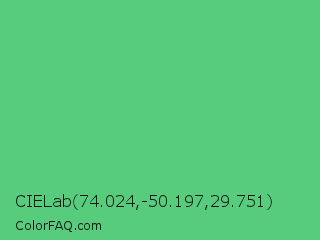 CIELab 74.024,-50.197,29.751 Color is a normal green color and the nearest color is Emerald #50c878. Hex code #58cc7d and RGB value is rgb(88,204,125). In RGB color space, this color is composed of 35% red, 80% green, 49% blue, In CMYK color space, this color is composed of 57% cyan, 0% magenta, 39% yellow , 20% black , In HSL color space, this color has a hue angle of 139° , 53% saturation and 57% lightness.