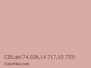 CIELab 74.028,14.717,10.733 Color is a light red color and the nearest color is Pastel Pink #dea5a4. Hex code #d8aca3 and RGB value is rgb(216,172,163). In RGB color space, this color is composed of 85% red, 67% green, 64% blue, In CMYK color space, this color is composed of 0% cyan, 20% magenta, 25% yellow , 15% black , In HSL color space, this color has a hue angle of 10° , 40% saturation and 74% lightness.