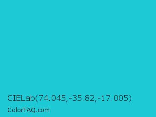 CIELab 74.045,-35.82,-17.005 Color is a normal cyan color and the nearest color is Java #1fc2c2. Hex code #1cc9d4 and RGB value is rgb(28,201,212). In RGB color space, this color is composed of 11% red, 79% green, 83% blue, In CMYK color space, this color is composed of 87% cyan, 5% magenta, 0% yellow , 17% black , In HSL color space, this color has a hue angle of 184° , 77% saturation and 47% lightness.