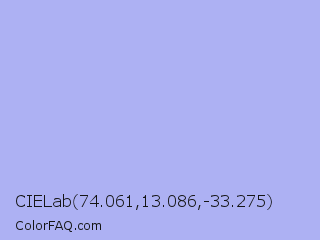 CIELab 74.061,13.086,-33.275 Color is a very light blue color and the nearest color is Perano #a9bef2. Hex code #adb1f3 and RGB value is rgb(173,177,243). In RGB color space, this color is composed of 68% red, 69% green, 95% blue, In CMYK color space, this color is composed of 29% cyan, 27% magenta, 0% yellow , 5% black , In HSL color space, this color has a hue angle of 237° , 74% saturation and 82% lightness.