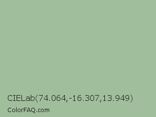 CIELab 74.064,-16.307,13.949 Color is a light green color and the nearest color is Norway #a8bd9f. Hex code #a1be9c and RGB value is rgb(161,190,156). In RGB color space, this color is composed of 63% red, 75% green, 61% blue, In CMYK color space, this color is composed of 15% cyan, 0% magenta, 18% yellow , 25% black , In HSL color space, this color has a hue angle of 111° , 21% saturation and 68% lightness.
