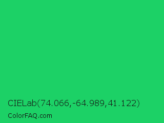 CIELab 74.066,-64.989,41.122 Color is a normal green color and the nearest color is Malachite #0bda51. Hex code #1cd166 and RGB value is rgb(28,209,102). In RGB color space, this color is composed of 11% red, 82% green, 40% blue, In CMYK color space, this color is composed of 87% cyan, 0% magenta, 51% yellow , 18% black , In HSL color space, this color has a hue angle of 145° , 76% saturation and 46% lightness.