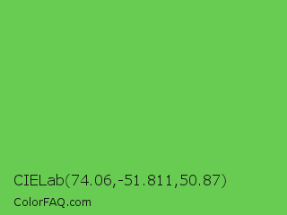 CIELab 74.06,-51.811,50.87 Color is a normal green color and the nearest color is Mantis #74c365. Hex code #69cc52 and RGB value is rgb(105,204,82). In RGB color space, this color is composed of 41% red, 80% green, 32% blue, In CMYK color space, this color is composed of 49% cyan, 0% magenta, 60% yellow , 20% black , In HSL color space, this color has a hue angle of 109° , 54% saturation and 56% lightness.