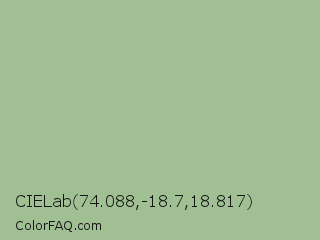 CIELab 74.088,-18.7,18.817 Color is a light green color and the nearest color is Laurel Green #a9ba9d. Hex code #a0bf93 and RGB value is rgb(160,191,147). In RGB color space, this color is composed of 63% red, 75% green, 58% blue, In CMYK color space, this color is composed of 16% cyan, 0% magenta, 23% yellow , 25% black , In HSL color space, this color has a hue angle of 102° , 26% saturation and 66% lightness.