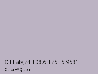 CIELab 74.108,6.176,-6.968 Color is a light purple color and the nearest color is Chatelle #bdb3c7. Hex code #bcb3c3 and RGB value is rgb(188,179,195). In RGB color space, this color is composed of 74% red, 70% green, 76% blue, In CMYK color space, this color is composed of 4% cyan, 8% magenta, 0% yellow , 24% black , In HSL color space, this color has a hue angle of 274° , 12% saturation and 73% lightness.