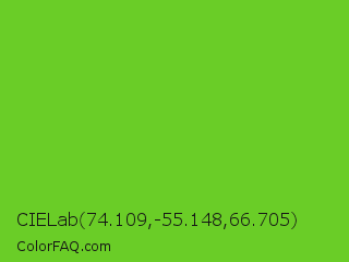 CIELab 74.109,-55.148,66.705 Color is a normal green color and the nearest color is Lima #76bd17. Hex code #6acd27 and RGB value is rgb(106,205,39). In RGB color space, this color is composed of 42% red, 80% green, 15% blue, In CMYK color space, this color is composed of 48% cyan, 0% magenta, 81% yellow , 20% black , In HSL color space, this color has a hue angle of 96° , 68% saturation and 48% lightness.