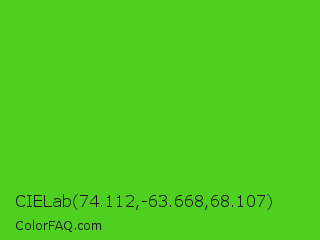 CIELab 74.112,-63.668,68.107 Color is a normal green color and the nearest color is Harlequin Green #46cb18. Hex code #4fd020 and RGB value is rgb(79,208,32). In RGB color space, this color is composed of 31% red, 82% green, 13% blue, In CMYK color space, this color is composed of 62% cyan, 0% magenta, 85% yellow , 18% black , In HSL color space, this color has a hue angle of 104° , 73% saturation and 47% lightness.