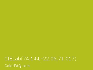 CIELab 74.144,-22.06,71.017 Color is a normal yellow color and the nearest color is Acid Green #b0bf1a. Hex code #b3bf1c and RGB value is rgb(179,191,28). In RGB color space, this color is composed of 70% red, 75% green, 11% blue, In CMYK color space, this color is composed of 6% cyan, 0% magenta, 85% yellow , 25% black , In HSL color space, this color has a hue angle of 64° , 74% saturation and 43% lightness.