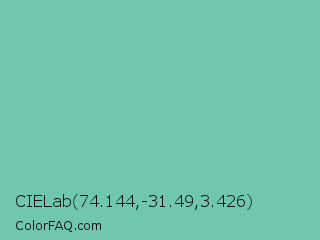 CIELab 74.144,-31.49,3.426 Color is a light cyan color and the nearest color is Neptune #7cb7bb. Hex code #70c6af and RGB value is rgb(112,198,175). In RGB color space, this color is composed of 44% red, 78% green, 69% blue, In CMYK color space, this color is composed of 43% cyan, 0% magenta, 12% yellow , 22% black , In HSL color space, this color has a hue angle of 164° , 43% saturation and 61% lightness.