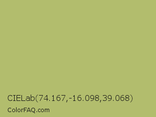 CIELab 74.167,-16.098,39.068 Color is a normal yellow color and the nearest color is Wild Willow #b9c46a. Hex code #b2bd6d and RGB value is rgb(178,189,109). In RGB color space, this color is composed of 70% red, 74% green, 43% blue, In CMYK color space, this color is composed of 6% cyan, 0% magenta, 42% yellow , 26% black , In HSL color space, this color has a hue angle of 68° , 38% saturation and 58% lightness.