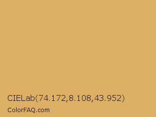 CIELab 74.172,8.108,43.952 Color is a light orange color and the nearest color is Earth Yellow #e1a95f. Hex code #ddaf65 and RGB value is rgb(221,175,101). In RGB color space, this color is composed of 87% red, 69% green, 40% blue, In CMYK color space, this color is composed of 0% cyan, 21% magenta, 54% yellow , 13% black , In HSL color space, this color has a hue angle of 37° , 64% saturation and 63% lightness.