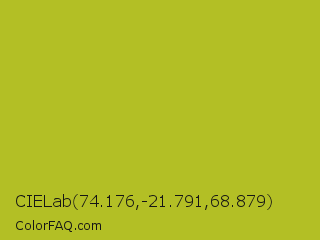 CIELab 74.176,-21.791,68.879 Color is a normal yellow color and the nearest color is Acid Green #b0bf1a. Hex code #b3bf25 and RGB value is rgb(179,191,37). In RGB color space, this color is composed of 70% red, 75% green, 15% blue, In CMYK color space, this color is composed of 6% cyan, 0% magenta, 81% yellow , 25% black , In HSL color space, this color has a hue angle of 65° , 68% saturation and 45% lightness.