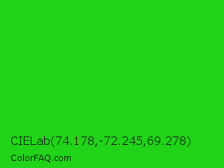 CIELab 74.178,-72.245,69.278 Color is a normal green color and the nearest color is Lime Green #32cd32. Hex code #21d319 and RGB value is rgb(33,211,25). In RGB color space, this color is composed of 13% red, 83% green, 10% blue, In CMYK color space, this color is composed of 84% cyan, 0% magenta, 88% yellow , 17% black , In HSL color space, this color has a hue angle of 117° , 79% saturation and 46% lightness.