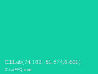 CIELab 74.182,-51.674,8.601 Color is a normal cyan color and the nearest color is Caribbean Green #00cc99. Hex code #12cea5 and RGB value is rgb(18,206,165). In RGB color space, this color is composed of 7% red, 81% green, 65% blue, In CMYK color space, this color is composed of 91% cyan, 0% magenta, 20% yellow , 19% black , In HSL color space, this color has a hue angle of 167° , 84% saturation and 44% lightness.
