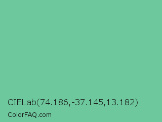 CIELab 74.186,-37.145,13.182 Color is a light green color and the nearest color is Silver Tree #66b58f. Hex code #6dc89d and RGB value is rgb(109,200,157). In RGB color space, this color is composed of 43% red, 78% green, 62% blue, In CMYK color space, this color is composed of 46% cyan, 0% magenta, 22% yellow , 22% black , In HSL color space, this color has a hue angle of 152° , 45% saturation and 61% lightness.