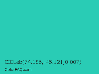 CIELab 74.186,-45.121,0.007 Color is a normal cyan color and the nearest color is Maximum Blue Green #30bfbf. Hex code #29ccb5 and RGB value is rgb(41,204,181). In RGB color space, this color is composed of 16% red, 80% green, 71% blue, In CMYK color space, this color is composed of 80% cyan, 0% magenta, 11% yellow , 20% black , In HSL color space, this color has a hue angle of 172° , 67% saturation and 48% lightness.