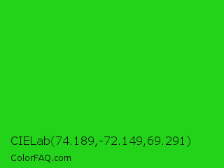 CIELab 74.189,-72.149,69.291 Color is a normal green color and the nearest color is Lime Green #32cd32. Hex code #22d319 and RGB value is rgb(34,211,25). In RGB color space, this color is composed of 13% red, 83% green, 10% blue, In CMYK color space, this color is composed of 84% cyan, 0% magenta, 88% yellow , 17% black , In HSL color space, this color has a hue angle of 117° , 79% saturation and 46% lightness.