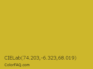 CIELab 74.203,-6.323,68.019 Color is a normal yellow color and the nearest color is Gold Metallic #d4af37. Hex code #cdb72b and RGB value is rgb(205,183,43). In RGB color space, this color is composed of 80% red, 72% green, 17% blue, In CMYK color space, this color is composed of 0% cyan, 11% magenta, 79% yellow , 20% black , In HSL color space, this color has a hue angle of 52° , 65% saturation and 49% lightness.