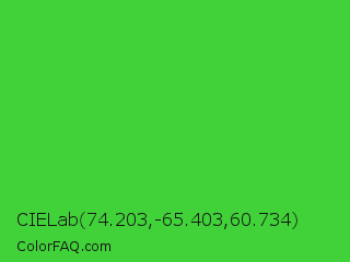 CIELab 74.203,-65.403,60.734 Color is a normal green color and the nearest color is Lime Green #32cd32. Hex code #41d139 and RGB value is rgb(65,209,57). In RGB color space, this color is composed of 25% red, 82% green, 22% blue, In CMYK color space, this color is composed of 69% cyan, 0% magenta, 73% yellow , 18% black , In HSL color space, this color has a hue angle of 117° , 62% saturation and 52% lightness.