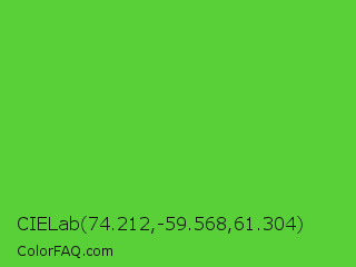 CIELab 74.212,-59.568,61.304 Color is a normal green color and the nearest color is Green RYB #66b032. Hex code #59cf38 and RGB value is rgb(89,207,56). In RGB color space, this color is composed of 35% red, 81% green, 22% blue, In CMYK color space, this color is composed of 57% cyan, 0% magenta, 73% yellow , 19% black , In HSL color space, this color has a hue angle of 107° , 61% saturation and 52% lightness.