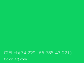CIELab 74.229,-66.785,43.221 Color is a normal green color and the nearest color is Malachite #0bda51. Hex code #0dd262 and RGB value is rgb(13,210,98). In RGB color space, this color is composed of 5% red, 82% green, 38% blue, In CMYK color space, this color is composed of 94% cyan, 0% magenta, 53% yellow , 18% black , In HSL color space, this color has a hue angle of 146° , 88% saturation and 44% lightness.