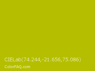 CIELab 74.244,-21.656,75.086 Color is a normal yellow color and the nearest color is La Rioja #b3c110. Hex code #b5bf00 and RGB value is rgb(181,191,0). In RGB color space, this color is composed of 71% red, 75% green, 0% blue, In CMYK color space, this color is composed of 5% cyan, 0% magenta, 100% yellow , 25% black , In HSL color space, this color has a hue angle of 63° , 100% saturation and 37% lightness.