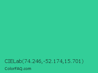 CIELab 74.246,-52.174,15.701 Color is a normal green color and the nearest color is Shamrock #33cc99. Hex code #32ce98 and RGB value is rgb(50,206,152). In RGB color space, this color is composed of 20% red, 81% green, 60% blue, In CMYK color space, this color is composed of 76% cyan, 0% magenta, 26% yellow , 19% black , In HSL color space, this color has a hue angle of 159° , 61% saturation and 50% lightness.