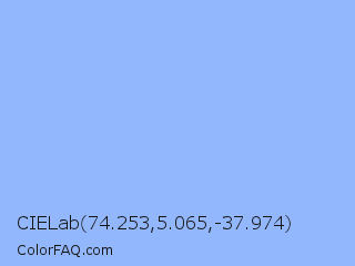 CIELab 74.253,5.065,-37.974 Color is a light blue color and the nearest color is Jordy Blue #8ab9f1. Hex code #93b7fc and RGB value is rgb(147,183,252). In RGB color space, this color is composed of 58% red, 72% green, 99% blue, In CMYK color space, this color is composed of 42% cyan, 27% magenta, 0% yellow , 1% black , In HSL color space, this color has a hue angle of 219° , 95% saturation and 78% lightness.