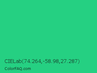 CIELab 74.264,-58.98,27.287 Color is a normal green color and the nearest color is Shamrock #33cc99. Hex code #25d082 and RGB value is rgb(37,208,130). In RGB color space, this color is composed of 15% red, 82% green, 51% blue, In CMYK color space, this color is composed of 82% cyan, 0% magenta, 38% yellow , 18% black , In HSL color space, this color has a hue angle of 153° , 70% saturation and 48% lightness.