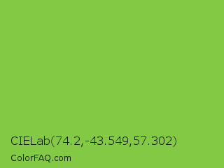CIELab 74.2,-43.549,57.302 Color is a normal green color and the nearest color is Yellow Green #9acd32. Hex code #83c944 and RGB value is rgb(131,201,68). In RGB color space, this color is composed of 51% red, 79% green, 27% blue, In CMYK color space, this color is composed of 35% cyan, 0% magenta, 66% yellow , 21% black , In HSL color space, this color has a hue angle of 92° , 55% saturation and 53% lightness.