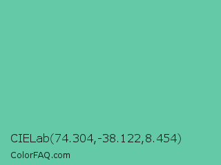 CIELab 74.304,-38.122,8.454 Color is a normal green color and the nearest color is Medium Aquamarine #66ddaa. Hex code #63c9a6 and RGB value is rgb(99,201,166). In RGB color space, this color is composed of 39% red, 79% green, 65% blue, In CMYK color space, this color is composed of 51% cyan, 0% magenta, 17% yellow , 21% black , In HSL color space, this color has a hue angle of 159° , 49% saturation and 59% lightness.
