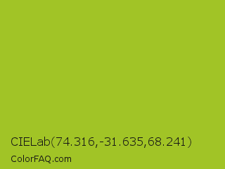 CIELab 74.316,-31.635,68.241 Color is a normal lime color and the nearest color is Atlantis #97cd2d. Hex code #a1c426 and RGB value is rgb(161,196,38). In RGB color space, this color is composed of 63% red, 77% green, 15% blue, In CMYK color space, this color is composed of 18% cyan, 0% magenta, 81% yellow , 23% black , In HSL color space, this color has a hue angle of 73° , 68% saturation and 46% lightness.