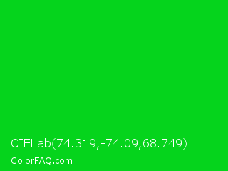 CIELab 74.319,-74.09,68.749 Color is a normal green color and the nearest color is Vivid Malachite #00cc33. Hex code #05d41c and RGB value is rgb(5,212,28). In RGB color space, this color is composed of 2% red, 83% green, 11% blue, In CMYK color space, this color is composed of 98% cyan, 0% magenta, 87% yellow , 17% black , In HSL color space, this color has a hue angle of 127° , 95% saturation and 43% lightness.
