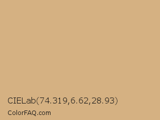 CIELab 74.319,6.62,28.93 Color is a light orange color and the nearest color is Tan #d2b48c. Hex code #d5b182 and RGB value is rgb(213,177,130). In RGB color space, this color is composed of 84% red, 69% green, 51% blue, In CMYK color space, this color is composed of 0% cyan, 17% magenta, 39% yellow , 16% black , In HSL color space, this color has a hue angle of 34° , 50% saturation and 67% lightness.