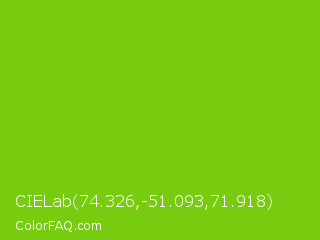 CIELab 74.326,-51.093,71.918 Color is a normal green color and the nearest color is Lima #76bd17. Hex code #78cc0f and RGB value is rgb(120,204,15). In RGB color space, this color is composed of 47% red, 80% green, 6% blue, In CMYK color space, this color is composed of 41% cyan, 0% magenta, 93% yellow , 20% black , In HSL color space, this color has a hue angle of 87° , 86% saturation and 43% lightness.