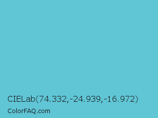 CIELab 74.332,-24.939,-16.972 Color is a light cyan color and the nearest color is Viking #64ccdb. Hex code #60c5d5 and RGB value is rgb(96,197,213). In RGB color space, this color is composed of 38% red, 77% green, 84% blue, In CMYK color space, this color is composed of 55% cyan, 8% magenta, 0% yellow , 16% black , In HSL color space, this color has a hue angle of 188° , 58% saturation and 61% lightness.