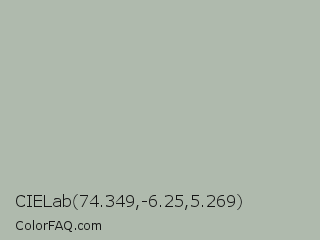 CIELab 74.349,-6.25,5.269 Color is a light green color and the nearest color is Ash Gray #b2beb5. Hex code #afbaad and RGB value is rgb(175,186,173). In RGB color space, this color is composed of 69% red, 73% green, 68% blue, In CMYK color space, this color is composed of 6% cyan, 0% magenta, 7% yellow , 27% black , In HSL color space, this color has a hue angle of 111° , 9% saturation and 70% lightness.