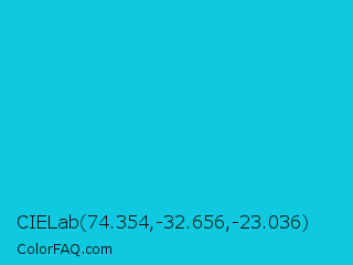 CIELab 74.354,-32.656,-23.036 Color is a normal cyan color and the nearest color is Dark Turquoise #00ced1. Hex code #0fc9e0 and RGB value is rgb(15,201,224). In RGB color space, this color is composed of 6% red, 79% green, 88% blue, In CMYK color space, this color is composed of 93% cyan, 10% magenta, 0% yellow , 12% black , In HSL color space, this color has a hue angle of 187° , 87% saturation and 47% lightness.