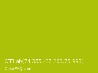 CIELab 74.355,-27.263,73.993 Color is a normal yellow color and the nearest color is Citrus #a1c50a. Hex code #abc208 and RGB value is rgb(171,194,8). In RGB color space, this color is composed of 67% red, 76% green, 3% blue, In CMYK color space, this color is composed of 12% cyan, 0% magenta, 96% yellow , 24% black , In HSL color space, this color has a hue angle of 67° , 92% saturation and 40% lightness.